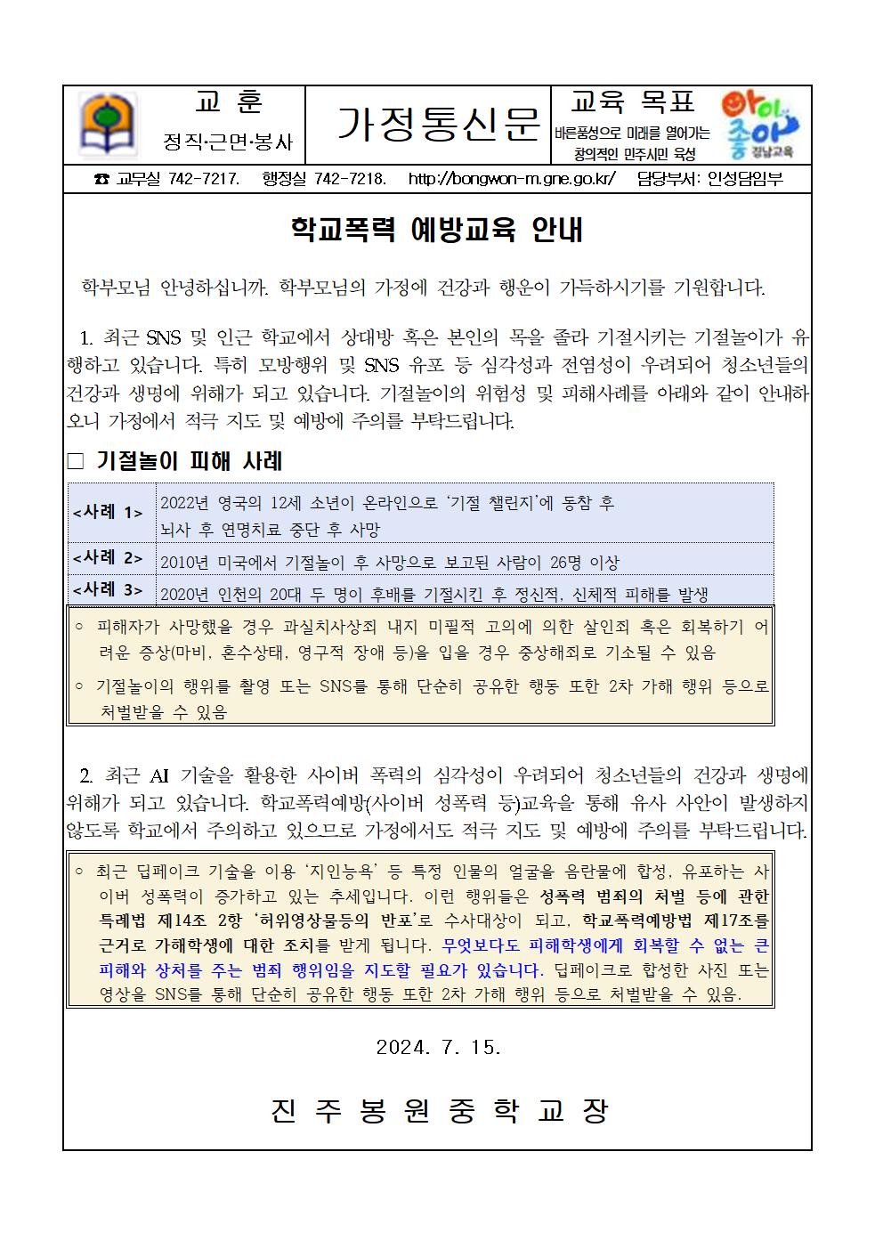 2024. 여름방학 학생생활 및 안전사고 예방을 위한 안내