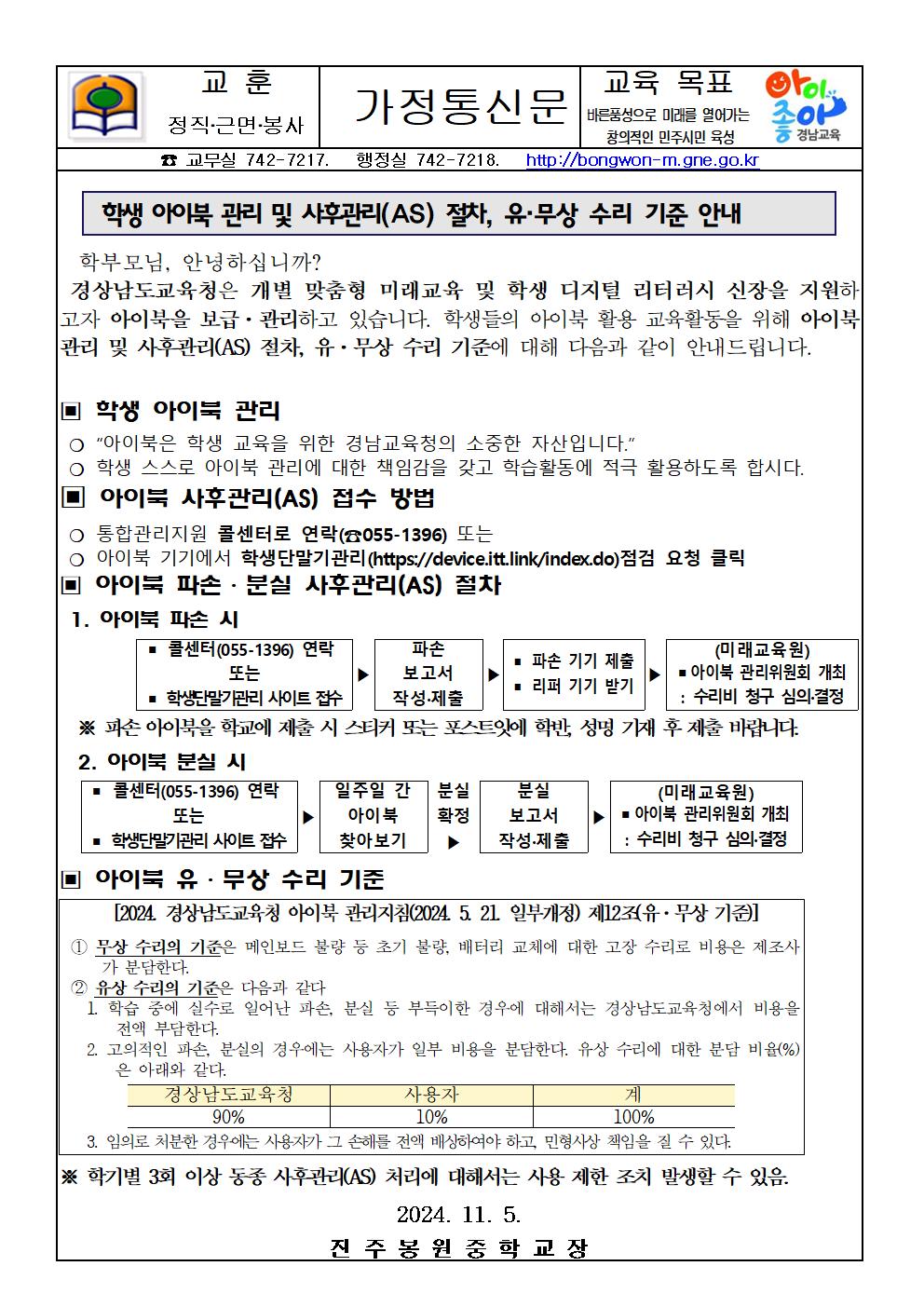 학생 아이북 관리 및 사후관리(AS)에 관한 안내