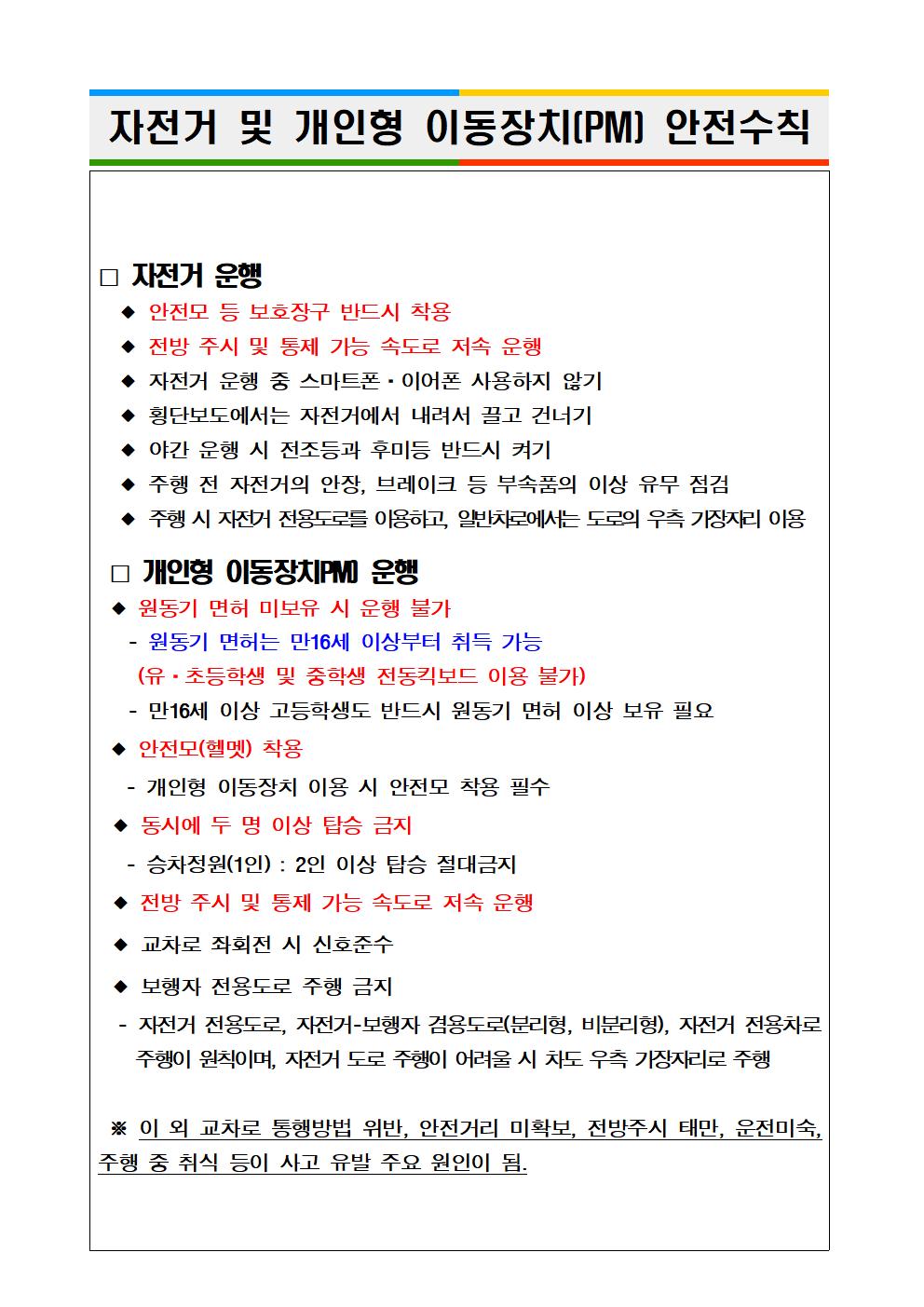 자전거 및 개인형 이동장치(PM] 안전 수칙 안내