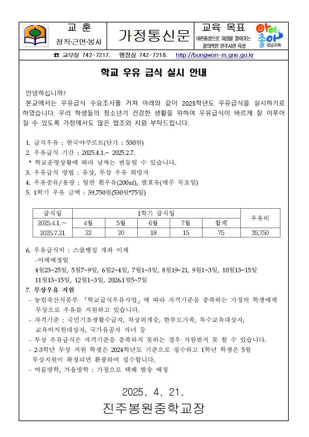 2025. 학교 우유 급식 실시 관련 안내