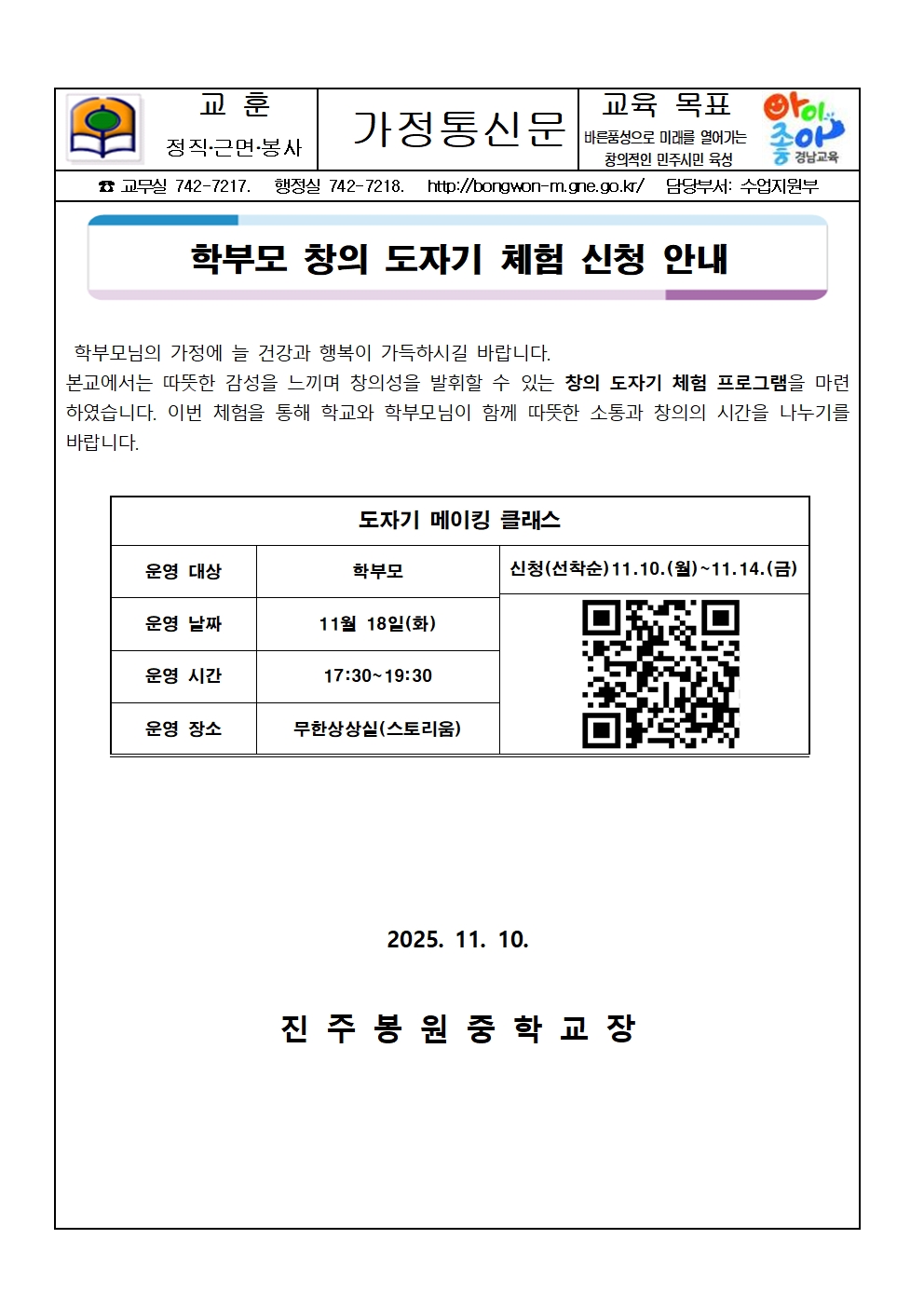 학부모 창의 도자기 체험 신청 안내